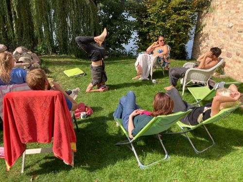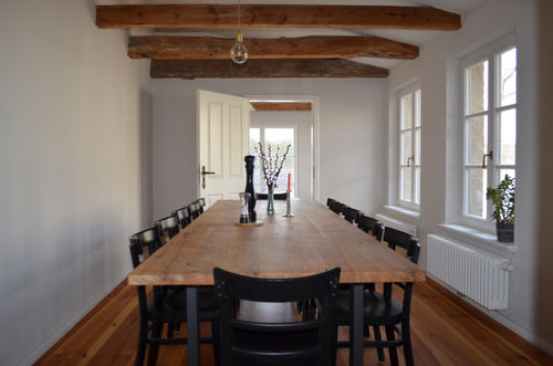 With 400 square meters of living space, this spacious 12-room property has recently been renovated in line with its listed status and furnished to a high standard. It has 6 separate bedrooms (including a very quiet connecting room), 3 bathrooms with bathtub or walk-in shower, a very large living room for relaxing and socializing, 6 bedrooms and a bathroom with shower;for exchange and relaxation, a 6 - 12 person conference room which also works very well as a dining room, a sauna, a pedal boat, SUPs, kayak, table football, very nice garden & terrace, Bullerjan stove, laser beamer, Apple TV and various beautiful views of the lake. 100MBit WLAN in the entire house.