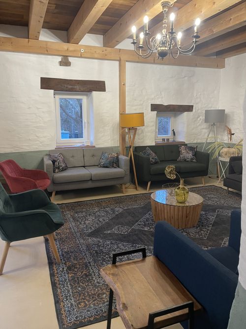 The outdoor area with its huge garden, fire pit and hot tub creates space for team events in the open air and unforgettable offsite moments. The combination of the rustic charm of a former Eifel farmhouse and modern, functional facilities is particularly special - here, work, meetings and relaxation merge into a unique experience.
