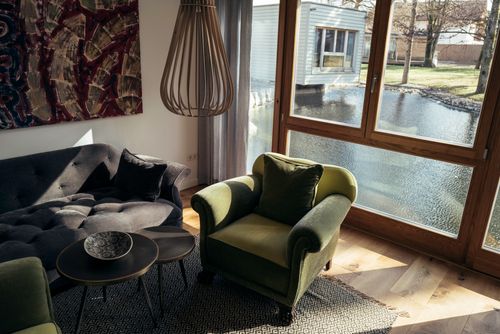 The natural pond in the park and private spa cube with sauna and relaxation room provide relaxation.